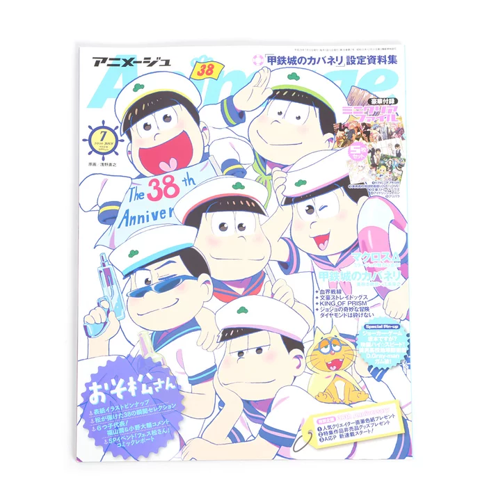 The hugely popular series Osomatsu-san appears on the July 2016 cover of Animage. As a special bonus you’ll receive 5 clear files based on King of Prism, Cute High Earth Defense Club Love!, Bungo Stray Dogs, and Prism Paradise, as well as pin-ups of Joker Game, Sakamoto Desu ga?, Free! Starting Days, Cute High Earth Defense Club Love!, D.Gray-man, and Gum Kare!.