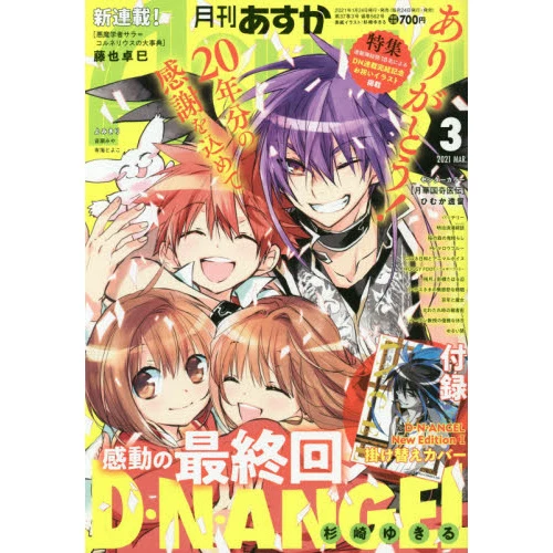 This month’s issue includes a main color feature on the finale of D.N.Angel, a color section featuring new serial Akuma Gakusha Sara Cornelius no Daijiten, one-shots including Tsuioku no Seisai and 5g no Aijo, and monochrome pages featuring Sakura no Mori no Oni Kurashi, Koharu Biyori to Animal Voice, Mr. Mellow Blue, Foggy Foot, Eden Kyoju no Yuuga na Kyujitsu, and more. Also included as a bonus is a D.N.Angel New Edition replaceable book cover!