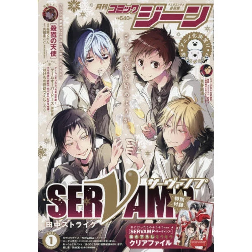 This month’s issue features Servamp on the cover and featured in the center color section along with Bakemono no Yawa Zukushi* and Game Overdose. There’s also a color header of Satsuriku no Tenshi and tons of the latest serials including Satsuten!, Kagerou Days, Nirvana, Koroshi Ai, Brave 10, Koisuru Shirokuma, Mr. Nietzsche in the Convenience Store, and Seishun Tetsudou, plus a bonus Servamp sparkly clear file featuring exclusive artwork too!