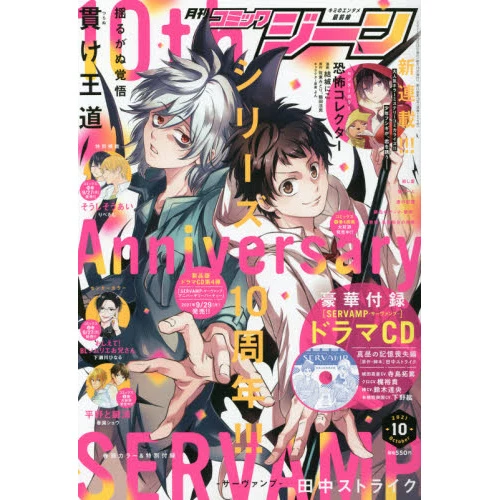 This month’s issue includes Servamp in the opening color spot, Hirano and Katsura, Kyofu Collector, and Oshiete! BL Sommelier Onii-san in the color spot, plus the finale of Zettai Zetsumei Game, and monochrome pages featuring Uso no Kioku, Higyaku no Noel, Koroshi Ai, Mao-sama to Shun-kun, Koisuru Shirokuma, and more. Also included as a bonus is a Servamp drama CD that fans won’t want to miss!