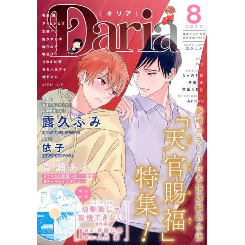 About Daria:**Daria is a Japanese monthly magazine published by Frontier Works, dedicated to serving BL fans by delivering the best in BL (boys’ love) manga! It's home to a magnificent array of incredible BL serials, including Gonin no Ou, Ookami wa Hana no Kaori, Blue Lust, and Natsume-kun wa Nan Demo Shitteru. Take a look inside and slip into BL heaven!