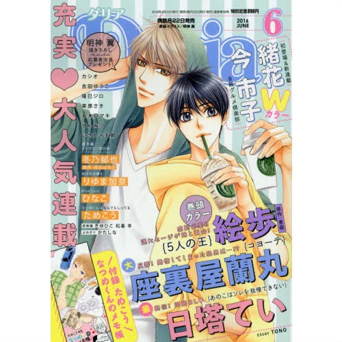 The June 2016 issue of Daria has yet another exciting lineup of serializations for you including mangaka Eniwa’s Gonin no Ou, Tei Hidou’s Ano Ko wa Sore o Gaman Dekinai, Ohana’s Hatsukoi Counter-Attack, and Ichiko Ima’s B-Kyuu Gourmet Club!