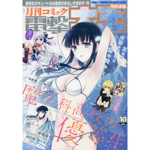 The October 2016 issue includes a big feature on The Irregular at Magic High School with color chapters of Hakoniwa Oukoku no Souzoushu-sama, Gabriel Dropout, and Giri Giri Out: Shuccho-ban, plus the finale of Re:Teen and the latest chapters of Yotsuba&!, Ero Manga-sensei, A Certain Magical Index, A Certain Scientific Accelerator, Strike the Blood, The Devil's a Part-Timer!, Toradora!, Muv-Luv Alternative, and tons more! Plus, this month's issue also comes with a special The Irregular at Magic High School clear file featuring summer artwork.