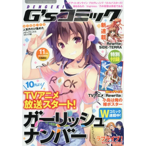 This month's issue celebrates the TV anime adaptation of Girlish Number with a feature on the series delving into the latest news. You'll also find new serial Rewrite: Side Terra, Love Live! School Idol Diary, and all the latest serials too plus a bonus Rewrite poster*!