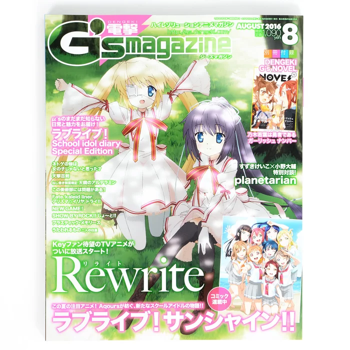 Get the latest on the anime adaptation of Rewrite in the August 2016 issue featuring cover artwork and a talk with Masakazu Morita and Chiwa Saito inside along with special articles on Planetarian and Love Live! Sunshine!!, a special look at upcoming new anime, and the latest chapters of your favorite comics too! Plus don't miss out on this month's bonus: the latest installment of Dengeki G's Novel!