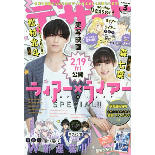 This month’s issue includes a main color feature on Liar x Liar, a color section featuring new serials Ochite Oborete and Bakuten!!, and monochrome pages featuring Osananajimi ga Saiteki Desu, Uruwashi no Yoi no Tsuki, Yubisaki to Koikoi, Zettai ni Tokimeite wa Ikenai!, Living no Matsunaga-san, Kimi to Aoi Haru no Hajimari, and more. Also included is an issue of Dessert Blue with six new works plus a Liar x Liar original fan book!