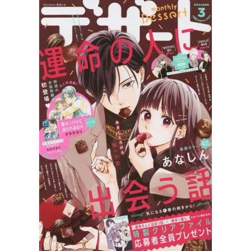 This month’s issue features Unmei no Hito ni Deau Hanashi on the cover and in the opening color spot, and you’ll also find the latest from Natsume-senpai ni Semarerareu Hibi, Uruwashi no Yoi no Tsuki, Yubisaki to Koikoi, Hananoi-kun to Koi no Byo, Tsumugu to Koi ni Naru Futari, Houkago Kiss Shoyo yo, N to S, Slow Jetcoaster, Osananajimi ga Saiteki Desu, and Ochite Oborete, plus the debut of Sayonara Summer, and even a bonus issue of Dessert Blue that features five new series!