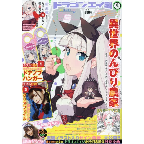 This month’s issue includes Isekai Nonbiri Nouka on the cover, and inside you’ll find a main color feature on new serial Chanto Suenai Kyuketsuki-chan, a center color section featuring KonoSuba, Blood Dome, and Kiniro no Monji Tsukai -Yusha Yonin ni Makikomareta Unique Cheat-, special one-shots including Anna ni Suki tte Itta no ni!, Kyu ni Ane ga Dekimashite!, Oshiharai wa Sakurairo de, Mia x Kiss, and more! Also included as bonuses are a Isekai Nonbiri Nouka doorknob hanger, plus a Nanaka Suwa clear file folder and gravure photos!