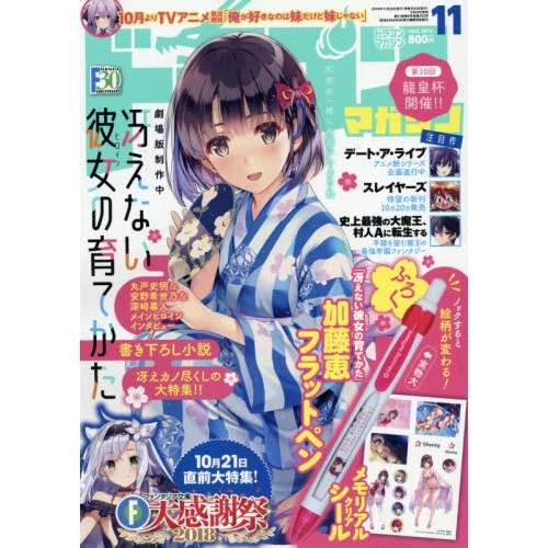 This month’s issue includes an in-depth feature on Saekano plus a bonus flat pen and memorial clear stickers!