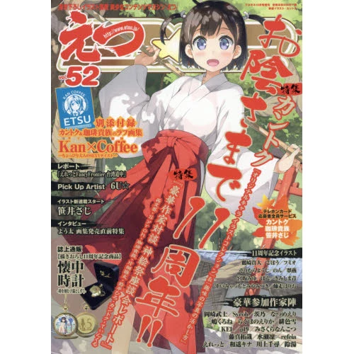 Included in this issue is a big feature on popular artist Kantoku that includes a collection of his original characters, plus a discussion between Haruhiko Mikimoto and Coffee Kizoku, an artist spotlight on 6U☆, an interview with Youta, a gravure collection in celebration of the magazine's 11th birthday, and the latest news on artists like Takahiro Tsurusaki, Gobou, Fimio, Youji Sorimura, Non, Miyu Miyasaka, Pan, Hirio Shiwasu, and others. Also included is a special "Kan x Coffee" rough draft illustration booklet featuring artwork from Kantoku and Coffee Kizoku.