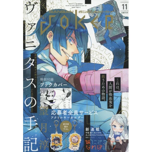This month's issue focuses on The Case Study of Vanitas with a cover spread and color feature inside along with a bonus deluxe book cover. Inside you'll also find color chapters of Is It Wrong to Try to Pick Up Girls in a Dungeon? Gaiden: Sword Oratoria, Shibuya Kingyo, Yomikakeru Hoshi, new serial Imouto Sae Ireba Ii Gaiden: Imouto Sae Nareba Ii!, and more.
