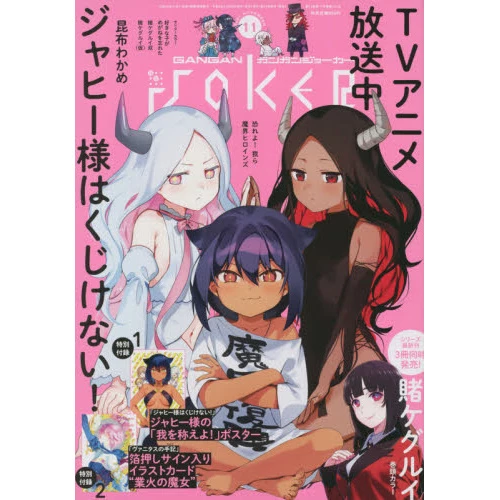 This month’s issue includes The Great Jahy Will Not Be Defeated! on the cover, and inside you’ll find Kakegurui in the opening color spot, a center color section featuring Suki na Ko ga Megane wo Wasureta, Kakegurui Futago, and Kakegurui (Kari), plus a special printing of Long Long Tap Only Only Look, a feature on Selection Project, and more. Also included as bonuses are a Case Study of Vanitas illustrated card and a The Great Jahy Will Not Be Defeated! B3 poster!
