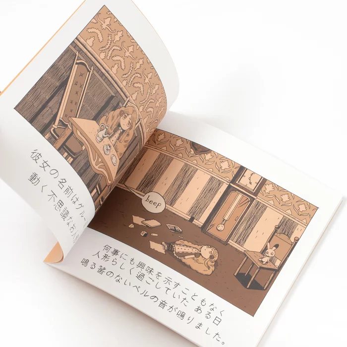 This 20-page, picture-book-style art book is in Japanese, and it's set before the events of Gloomy the Livingdoll 1.