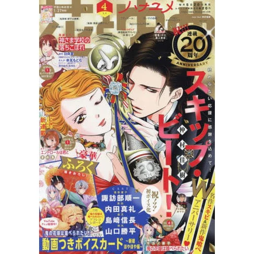 This first issue of February 2022 features Kamisama Gakko no Ochikobore in the opening color spot, and you’ll also find new serial End Roll wa Kimi to, the latest from ongoing serials including Tsuiraku JK to Haijin Kyoushi, Koi ni Mudaguchi, Noroi Ko no Meshitsukai, Skip Beat!, Furare Girl, Shitsuji Kuroboshi wa Kashizukanai, and Meitantei Kouko wa Yuutsu, plus gag manga like Nekozuke!, Settei Tantei, and more! Also included as a bonus is an Oni no Hanayome wa Taberaretai “Steaming Hot Newlywed Edition” voice card and video!