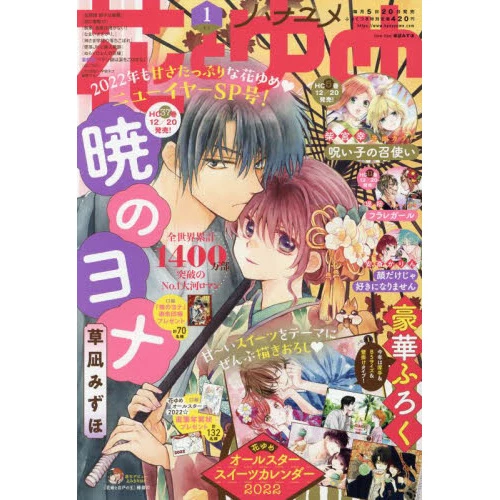 This first issue of 2022 starts the year off right with the latest must-see shojo manga including Noroiko no Meshitsukai in the opening color spot, color pages featuring Kao Dake Ja Suki ni Narimasen and Furare Girl, and monochrome pages featuring Yona of the Dawn, Tsuiraku JK to Haijin no Kyoshi, Namaiki Zakari, Koi ni Mudaguchi, Meitantei Kouko wa Yuutsu, Shitsuji Kuroboshi wa Kashizukanai, and more. Also included as a bonus is a 2022 HanaYume All-Star Sweets calendar!
