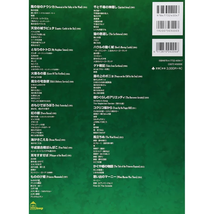 The works of Hayao Miyazaki and Studio Ghibli are well known for their delightful scores. This 344-page sheet music book includes some of the best-loved songs from Nausicaä: Valley of the Wind to When Marnie Was There rearranged for solo piano.