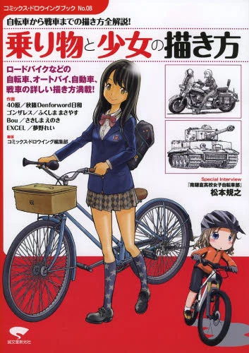 This volume spanning 143 B5 pages acts as a guide for drawing such vehicles with girls to ensure you get cute but realistic illustrations. Besides detailed examples and explanations, it also features a special interview with Noriyuki Matsumoto, the author of Minami Kamakura Kōkō Joshi Jitensha-Bu!