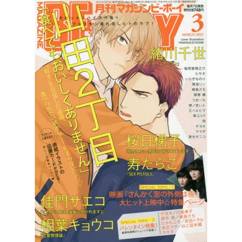 This month’s issue includes new serials Sayonara, Nanatsu no Violin and kore kara Ore wa, Senpai ni Idakaremasu 2 plus Renai Kanjoron, Tabeteme Oishiku Arimasen, Sex Pistols, Lottery, Hadashi no Tenshi, Nikushoku Kumikyoku, Cosmetic Play Lover, Twilight Play Lover, Caste Heaven, Dekichatta Danshi, and more. There is also a Valentine's special with artwork from Kakine, Dayoo, Nyankoro, Toworu Miyada, and more!