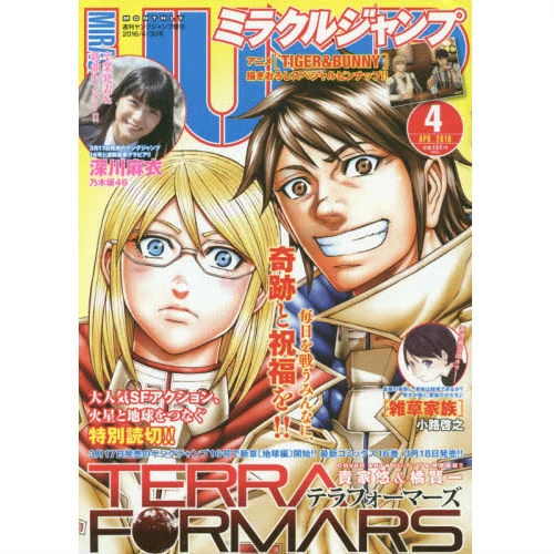 Featured on the cover of the April 2016 issue of Miracle Jump is the wildly popular action and science fiction series by Yu Sasuga, Terra Formars.