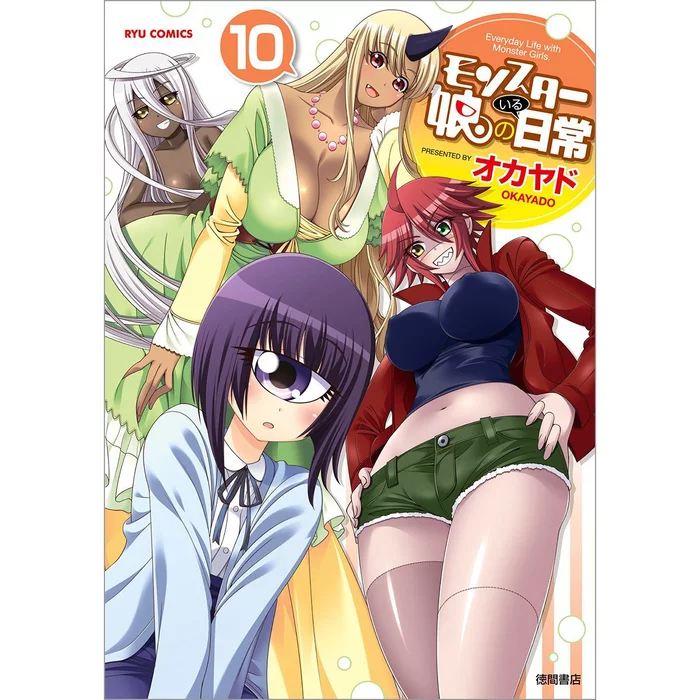 Vol. 10 of the hilarious love comedy/harem manga written and illustrated by Okayado spans 168 pages and features Zombina, the ogre Tionishia, the monoeye Manako, and the shapeshifter Doppel on the cover.