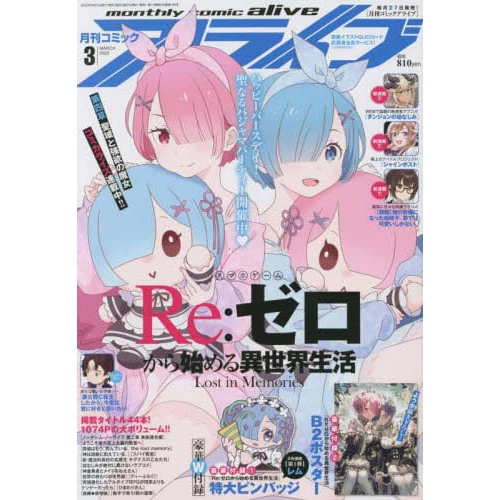 About Monthly Comic AliveWith young adults as its target demographic, Monthly Comic Alive is a monthly publication from Kadokawa with an emphasis on manga adaptations of light novels from the same publisher, although some originals have been featured. Popular serializations have included The “Hentai” Prince and the Stony Cat, Kantai Collection and Zero no Tsukaima, and issues often include small presents and posters!