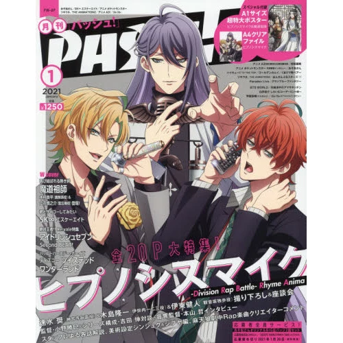 This month’s issue includes a main feature on Hypnosis Mic: Division Rap Battle – Rhyme Anima that focuses on Shinjuku Division’s Matenro and includes interviews with the staff and cast, a recap of the story so far, and more. Also featured this month are Disney: Twisted Wonderland, Jujutsu Kaisen, IDOLiSH 7: Second Beat!, Haikyu!! To the Top, Golden Kamuy, and Attack on Titan: The Final Season. This month’s bonuses include a Hypnosis Mic large A1-size poster and A4-size clear file, and a collection of special pin-ups!