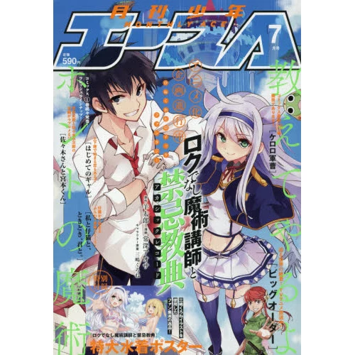 The front cover of the July 2016 issue features a cute illustration of Sistina Feebell and Glen Reiders from Kurone Mishima's Roku de Nashi Majutsu Koushi to Akashic Records, and this issue also comes with a poster of Sisti and her friend Rumia Tingel posing in their bikinis – perfect for summer!