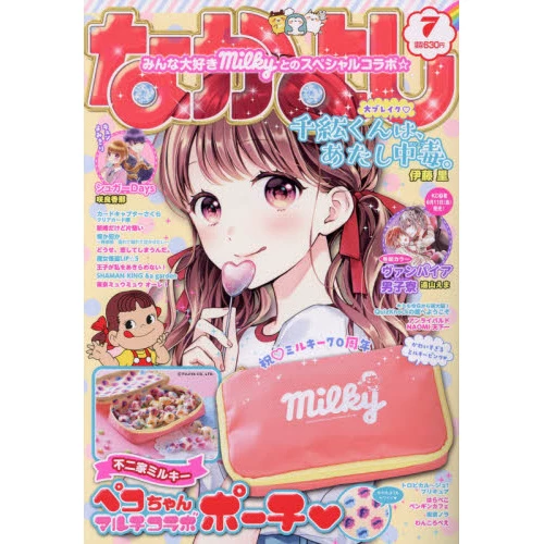 This month’s issue includes Vampire Danshiryo in the opening color spot, Cardcaptor Sakura: Clear Card in the color spot, and monochrome pages featuring Douse, Koishite Shimau n Da, Harapeko Penguin Cafe, Tokyo Nora, Shinkon Dakedo Kataomoi, Wankorobee, Shaman King & a Garden, Ouji ga Watashi wo Akiramenai!, and more. Also included as a bonus is a Fujiya Milky Peko-chan collab pouch!