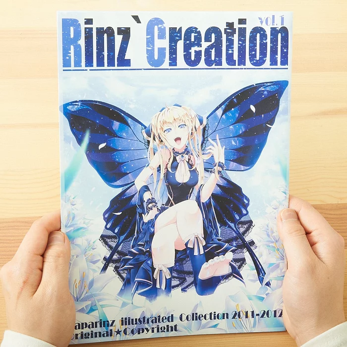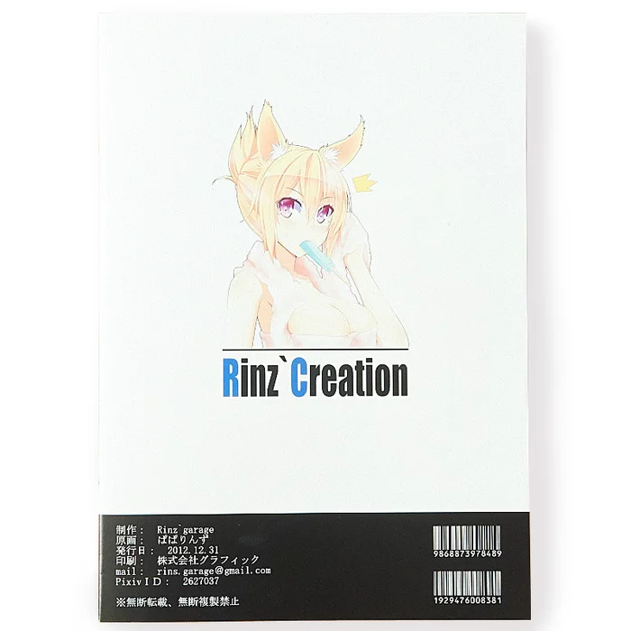 TOM Special Creator Paparinz is skilled at drawing beautiful girls, especially those with fox ears! This goods set includes a tumbler that features art of a sexy girl with wings and a tote bag of a sweet fox-eared girl. A doujinshi is also includes as a bonus! Rinz`Creation Vol. 1 includes original art with gorgeous characters and different themes including mecha, moe, and fantasy. Work illustrations as well as FF, P4U, and Touhou fanart is also included.