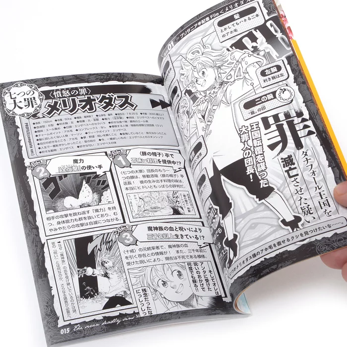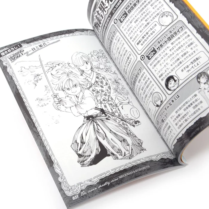 In this Japanese book you can learn everything you ever wanted to know about the Third Princess of the Kingdom of Liones, Elizabeth and the captain of the Seven Deadly Sins, Meliodas, the intriguing duo who set out on an epic journey to find the rest of the Deadly Sins and fight the Holy Knights.